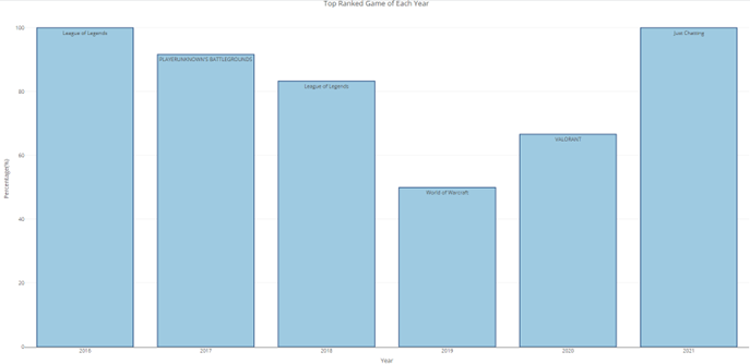 From Figure 3, it is clear that every year sees a different game being ranked top except for “League of Legends” which was top ranked in both 2016 and 2018. “World of Warcraft” was the top ranked game with the lowest percentage in its respective year with 50%. The latest game to be crowned top and also dominating its ranking throughout the year is “Just Chatting” with a complete score of 100%.